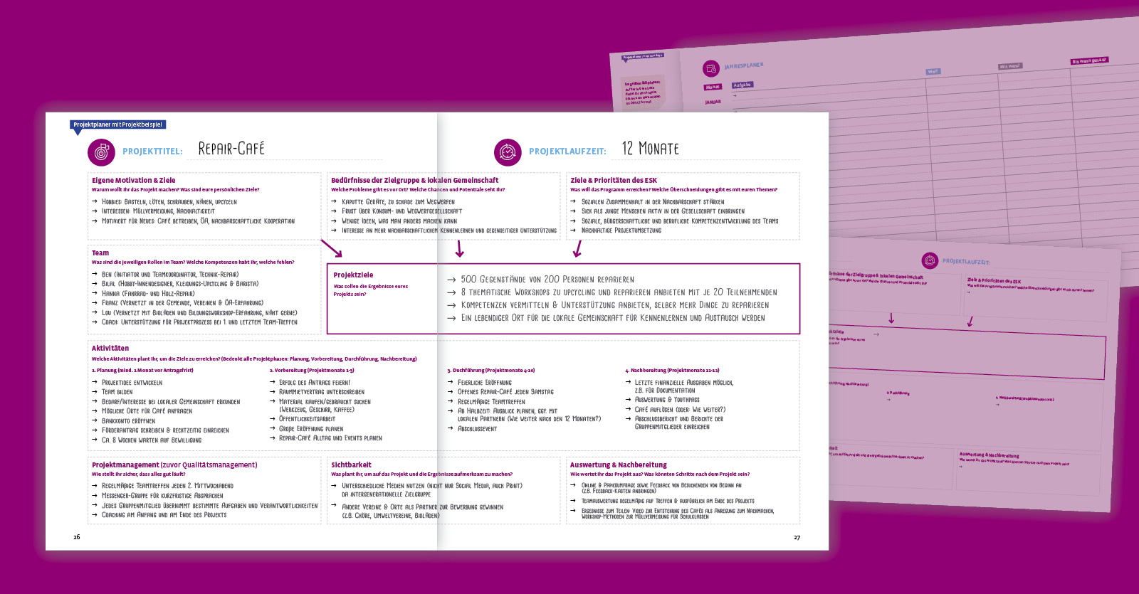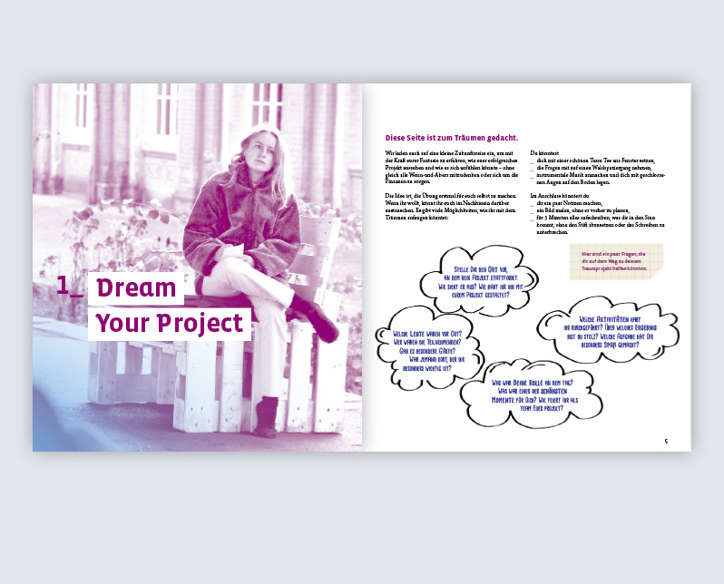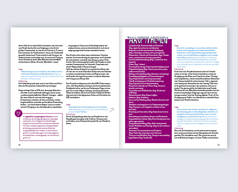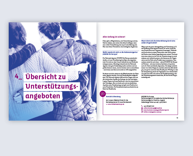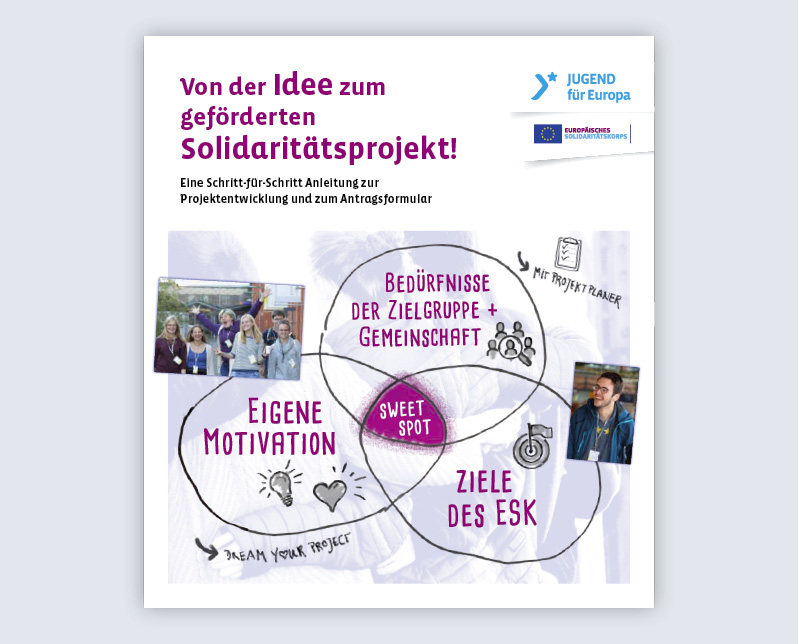 Das Handbuch von JUGEND für Europa (Nationale Agentur Europäisches Solidaritätskorps und Erasmus+ Jugend; gefördert durch das Bundesministerium für Familie, Senioren, Frauen und Jugend) ging gestalterisch durch unsere Hände: Eine Schritt-für-Schritt Anleitung zur Projektentwicklung für geförderte Solidaritätsprojekte. – Uns macht es besondere Freude über unsere Gestaltung, jungen Menschen die Partizipation an Politik und Gesellschaft schmackhaft zu machen …
