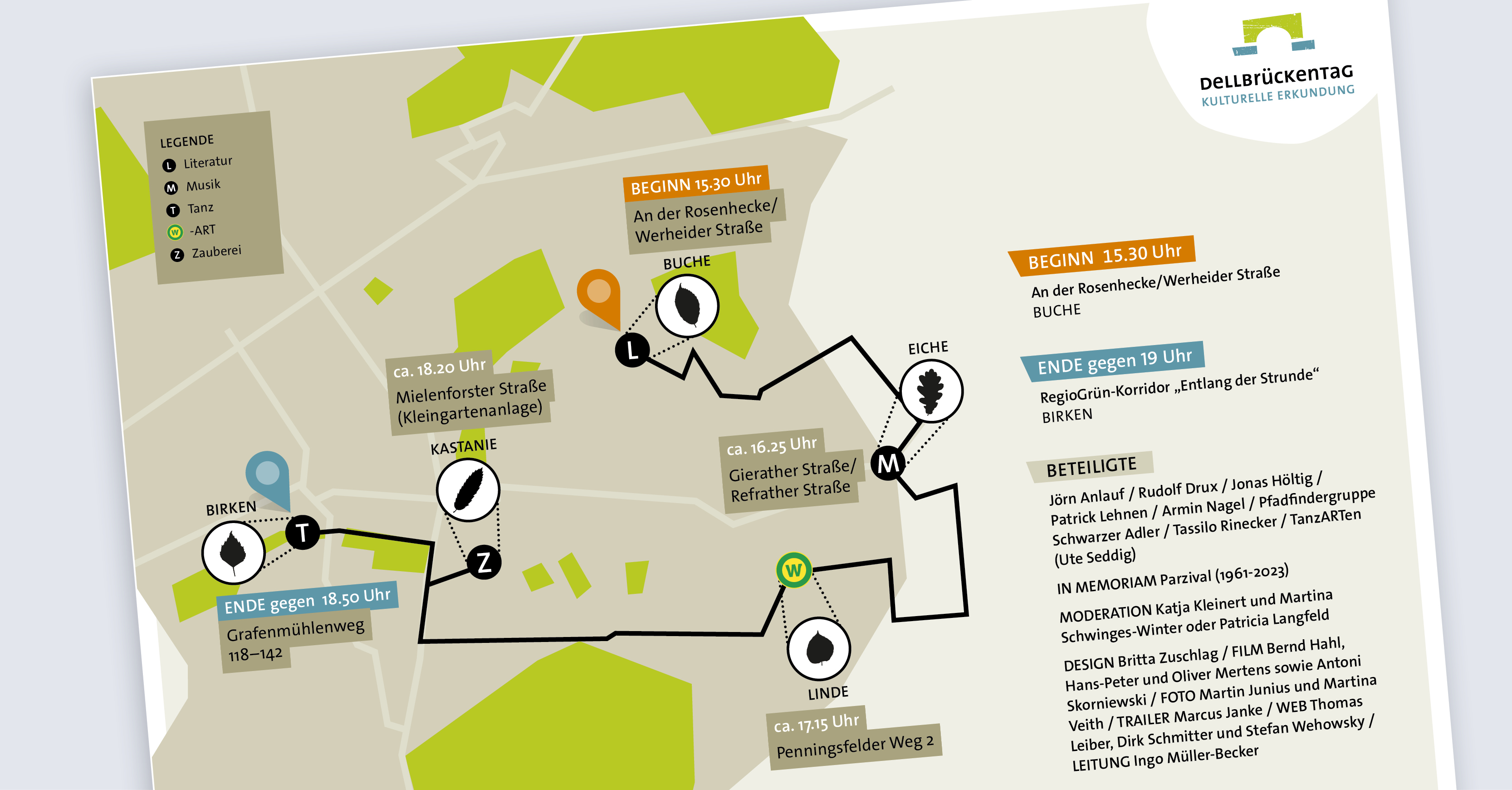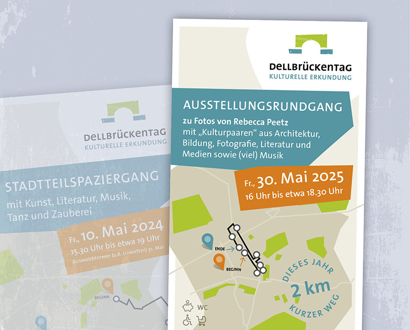 Der Dellbrückentag lädt jährlich an einem Brückentag zur kulturellen Erkundung des Stadtteils ein. Mit dem Konzept „Wir verbinden Orte und Menschen – mit Kultur bewegen!“ organisiert Ingo Müller-Becker seit 2018 das Veedel-Event. Wir durften sowohl Logo als auch Corporate Design entwickeln und freuen uns jedes Jahr auf das Erstellen der neuen Flyer, Plakate und Banner. In diesem Jahr findet der Jubiläumsspaziergang des Dellbrückentags am Freitag, den 15. Mai 2026 statt – mit dem Thema „Von Sinn zu Sinn“.