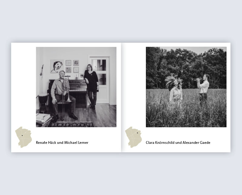 Die Fotoserie der Fotografin Rebecca Peetz zu „Kulturpaaren“ (aus den Bereichen Architektur, Fotografie, Literatur und Medien) war Mittelpunkt beim Dellbrückentag-Ausstellungsrundgang 2025. Die Fotos sind das Ergebnis eines über zweijährigen Arbeitsprozesses. – Wir gestalteten sehr gerne diesen kleinen quadratischen Folder mit den wunderschönen und einfühlsamen Bildern von Rebecca Peetz. Herausgeber ist kulturPlan/Ingo Müller-Becker.