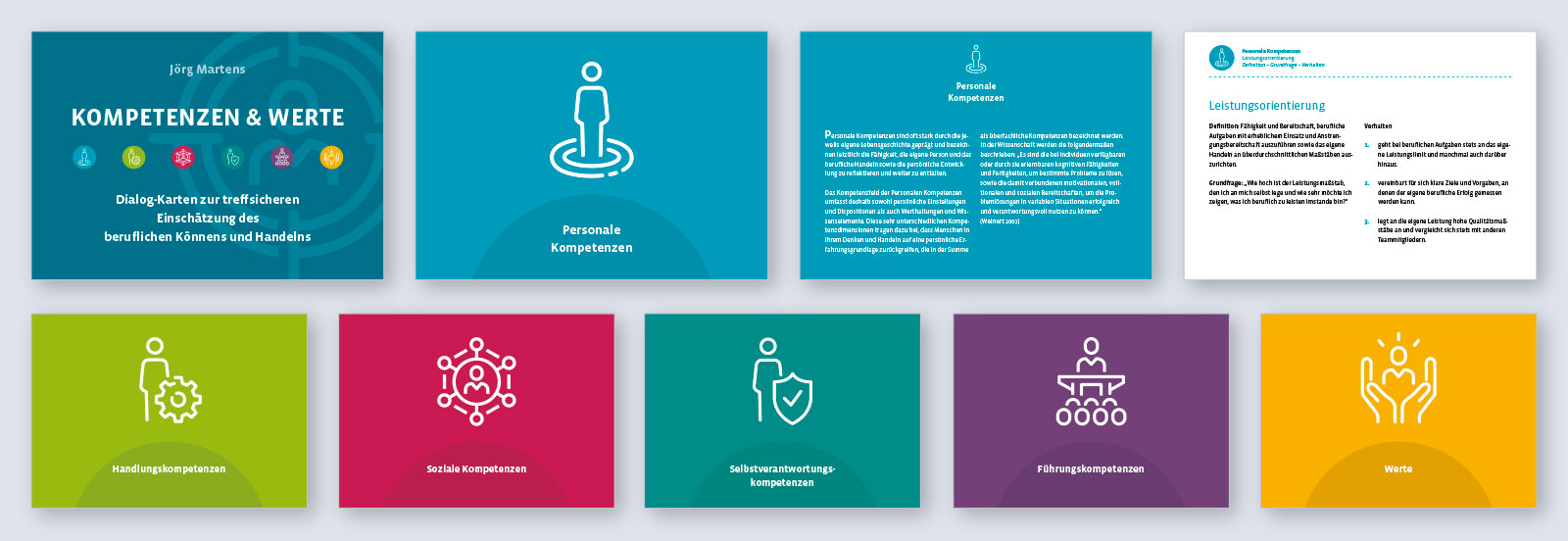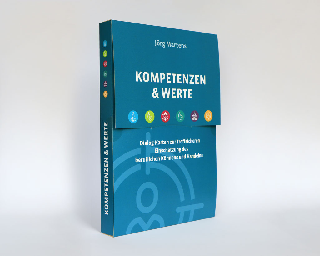 Dr. Jörg Martens beschäftigt sich als Professor an der Hochschule der Diakonie in Bielefeld u. a. mit den Themen Talentmanagement, Potenzialdiagnostik, Kompetenzmodelle und Innovationen im Personalmanagement. Als praktische Umsetzung seiner Forschung entwickelte er einen Satz Dialog-Karten, mit deren Hilfe Bewerbungsinterviews geführt werden können bzw. man sich auf Bewerbungsgespräche hinsichtlich der eigenen Selbsteinschätzung vorbereiten kann. Zu jeder Karte entstand zudem ein erläuterndes Video das über einen QR-Code eingebunden ist. Die Karten in Form einer Loseblattsammlung wurden zusammen mit einer Broschüre in einer praktischen Steckmappe konfektioniert.