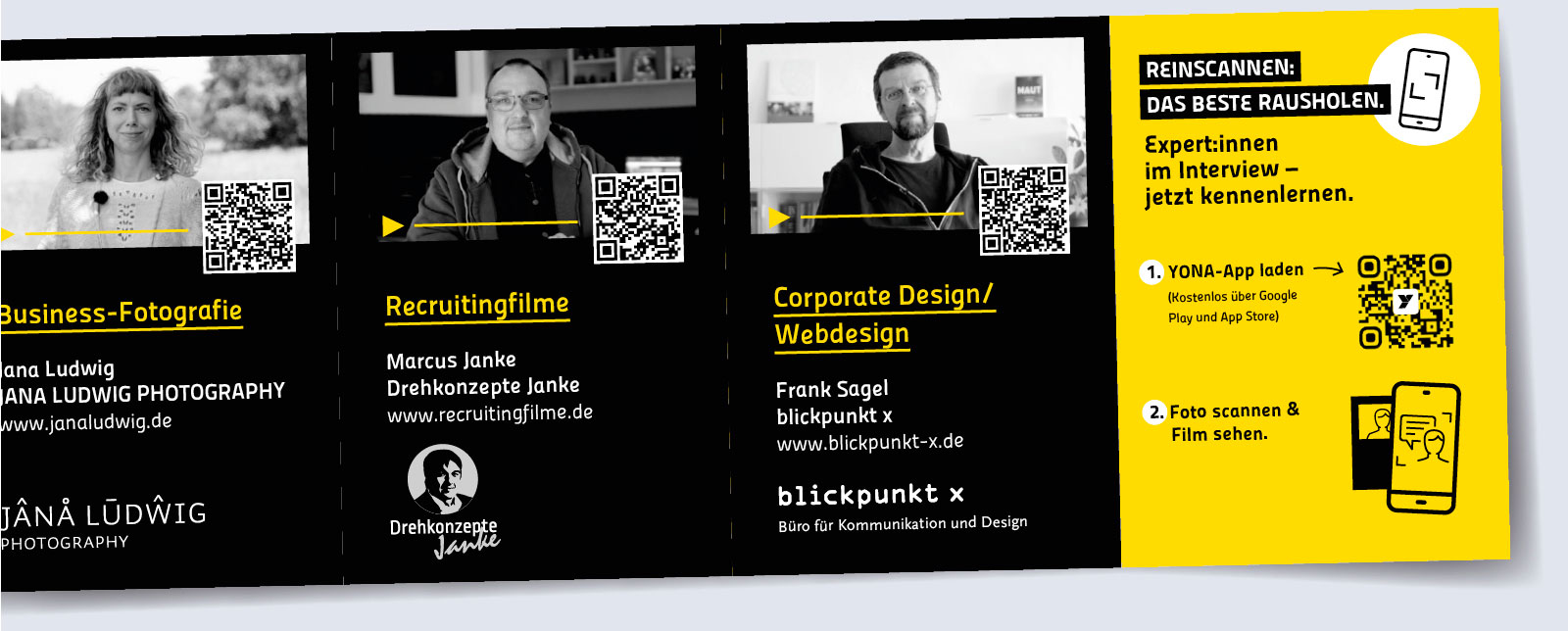 In dem 16-seitigen Leporello im charmanten DIN A7-Format ist es durch die YONA-App möglich, das Printmedium lebendig werden zu lassen. Hat man diese App auf sein Smartphone geladen ist es ohne Zeitverzögerung möglich, direkt in die Videos reinzuschauen (funktioniert übrigens auch am Bildschirm ... ;-) – alternativ steht der individuelle QR-Code zur Verfügung.