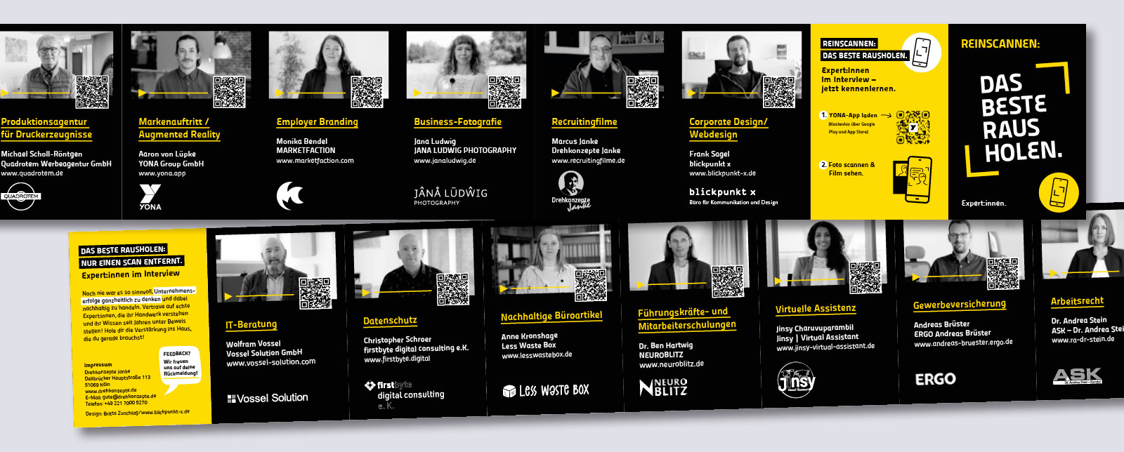 Expert:innen kennenlernen über Augmented Reality – der Regisseur Marcus Janke hat in kurzen Filmen 12 Expert:innen zu ihren beruflichen Kernthemen befragt: die Felder reichen über Business Fotografie, Employer Branding, Recruitingfilm bis hin zu Datenschutz und IT Beratung (u.a.).