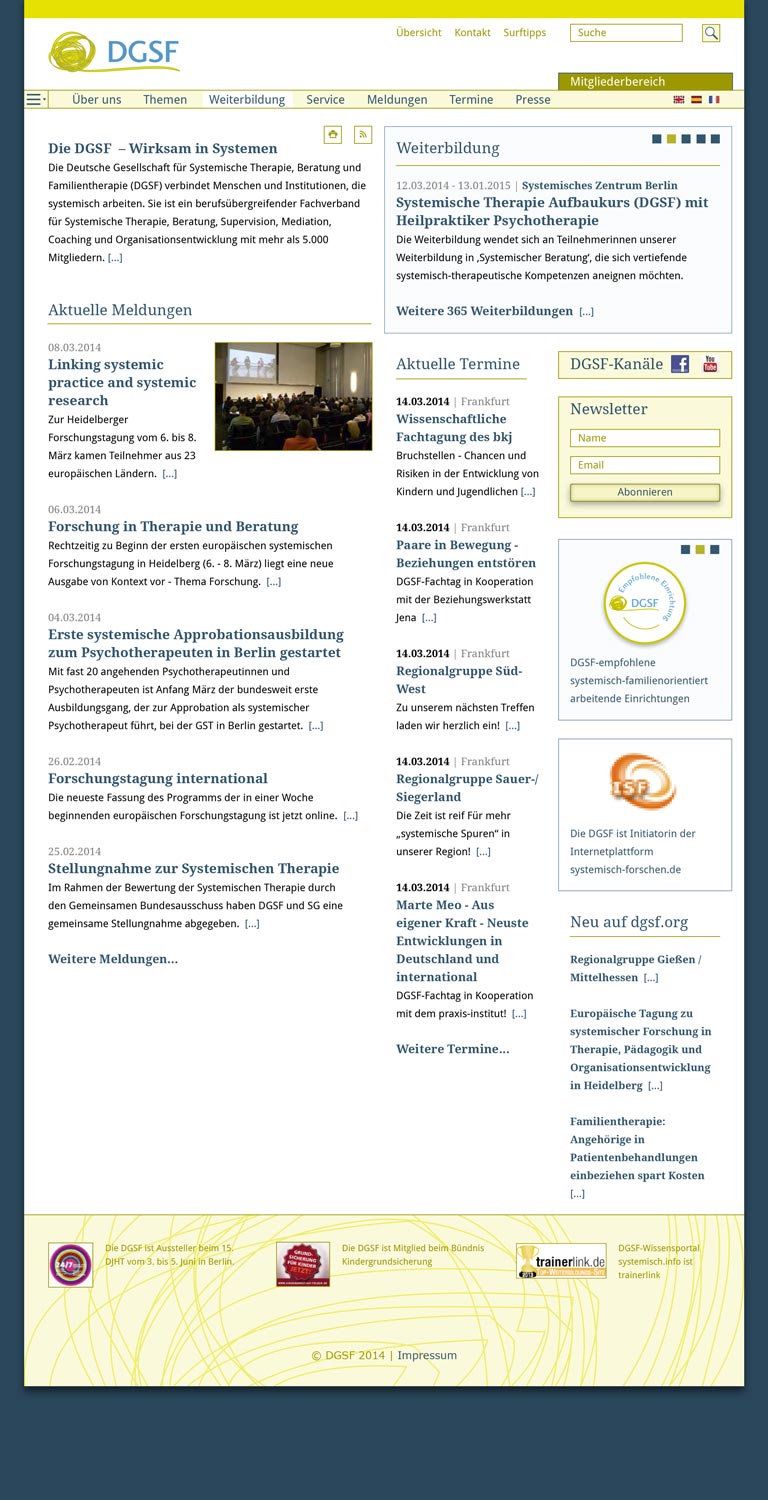 Die DGSF beauftragte ein Redesign ihrer Website. Das mit dem CMS Plone umgesetzte Portal beinhaltet Profilseiten von mehreren tausend Mitgliedern und eine Geodaten gestützte Therapeuten-Suche. Daneben gibt es eine Datenbank für systemische Weiterbildungen, welche von den ca. 80 DGSF-Instituten bestückt wird. Wichtig war der DGSF eine hohe Datensicherheit und die Möglichkeit, dass ihre Mitglieder und Gremien eigenständig Content erstellen können, der je nach Veröffentlichungsebene durch Workflows gesteuert wird. Das CMS Plone ist dafür die ideale Grundlage, da es sich über Frontend-Editing sehr intuitiv bedienen lassen kann. Seit 2014 online.