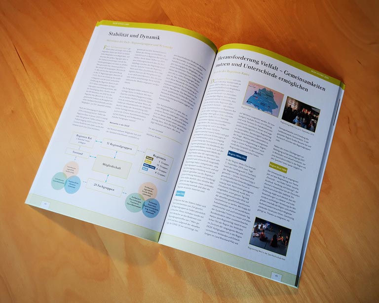 Seit 2007 gestalten wir die Mitgliederzeitschrift der DGSF, die als Jahresbericht fungiert. Neben dem Satz und Layout der einzelnen Ausgaben gestalten wir auch Infografiken und Anzeigen. Inzwischen wird das Magazin auch klimaneutral auf Umweltpapier herausgegeben. Die Versandvorbereitung an die 8.500 Mitglieder des Kunden erfolgt durch einen inklusiv wirtschaftenden Lettershop in Köln.
